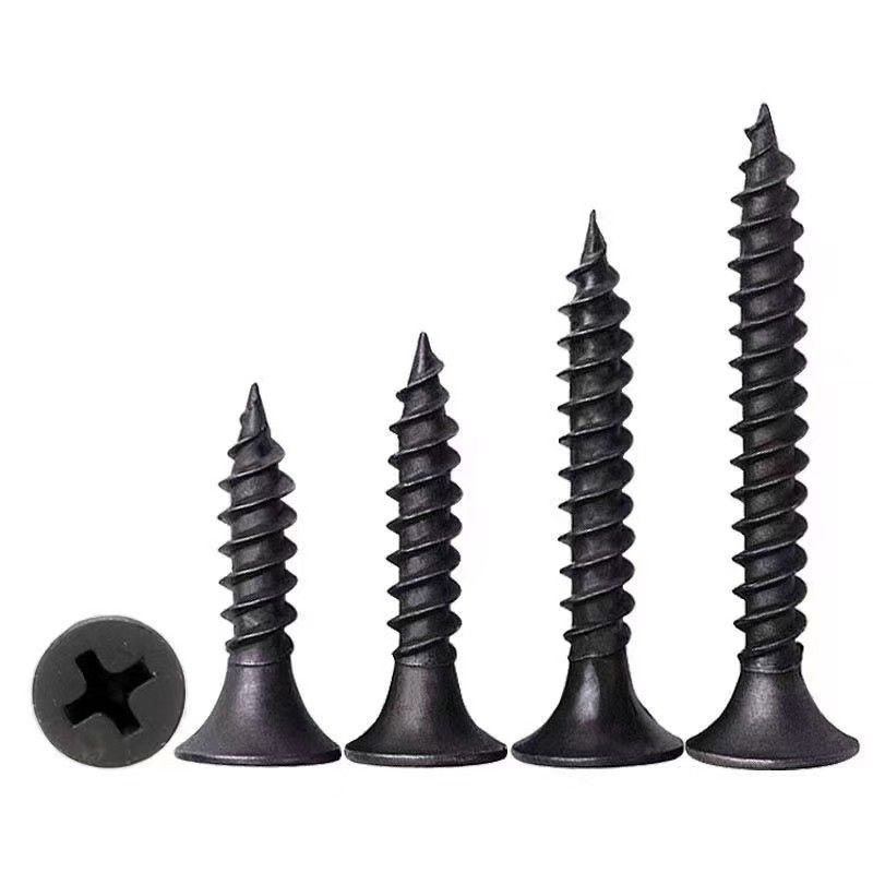 Black Philips-head drywall screws are corrosion-resistant fasteners designed for securing drywall (gypsum board) to wood or metal framing. They feature a Philips (“+”) drive for easy screw-gun or screwdriver use, a bugle head that seats flush without tearing the paper surface, and a black phosphate or coated finish that helps resist rust and improves bit grip. Available in various lengths and thread types (coarse for wood studs, fine for metal), they’re a standard choice for interior drywall installation.